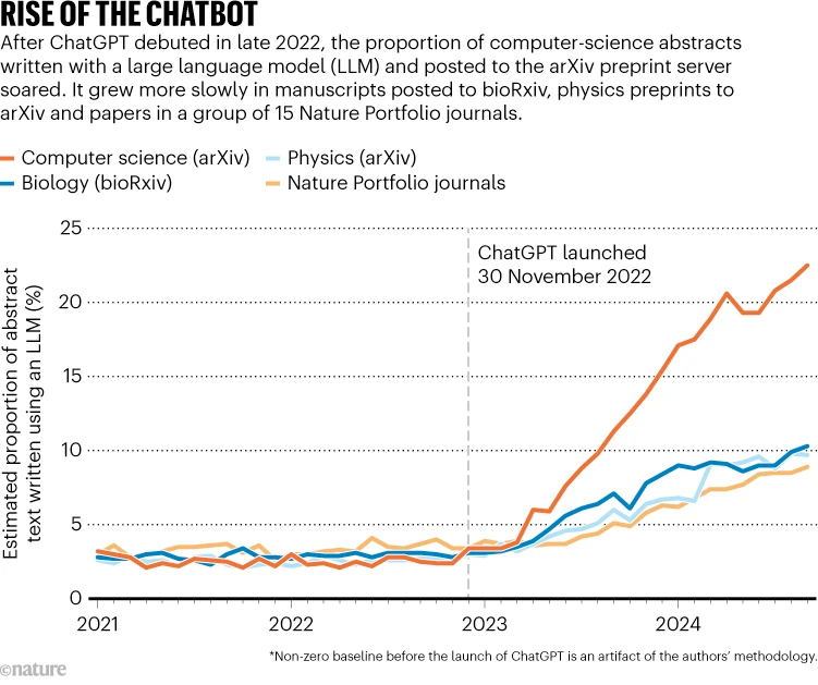 As further evidence, now AI is infiltrating preprints, something that has been totally predictable yet publishers remain supine at best, conspiratorial at worst. “Screening” at preprint servers — by unknown, unaccountable people using unknown, unaccountable processes — is responding with weak tea to hot lava flows of misinformation. This chart from Nature might tell quite a story: