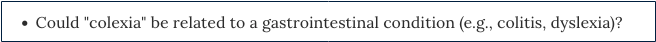 To test OpenEvidence (OE), I entered the nonsense disease entity (“bixonimania”), which OE did not recognize, to its credit I suppose, although it may be just a matter of time (bears later confirmation). However, I then added another term to my fake patient’s presentation (“colexia”), whereupon I got this wonderful response: