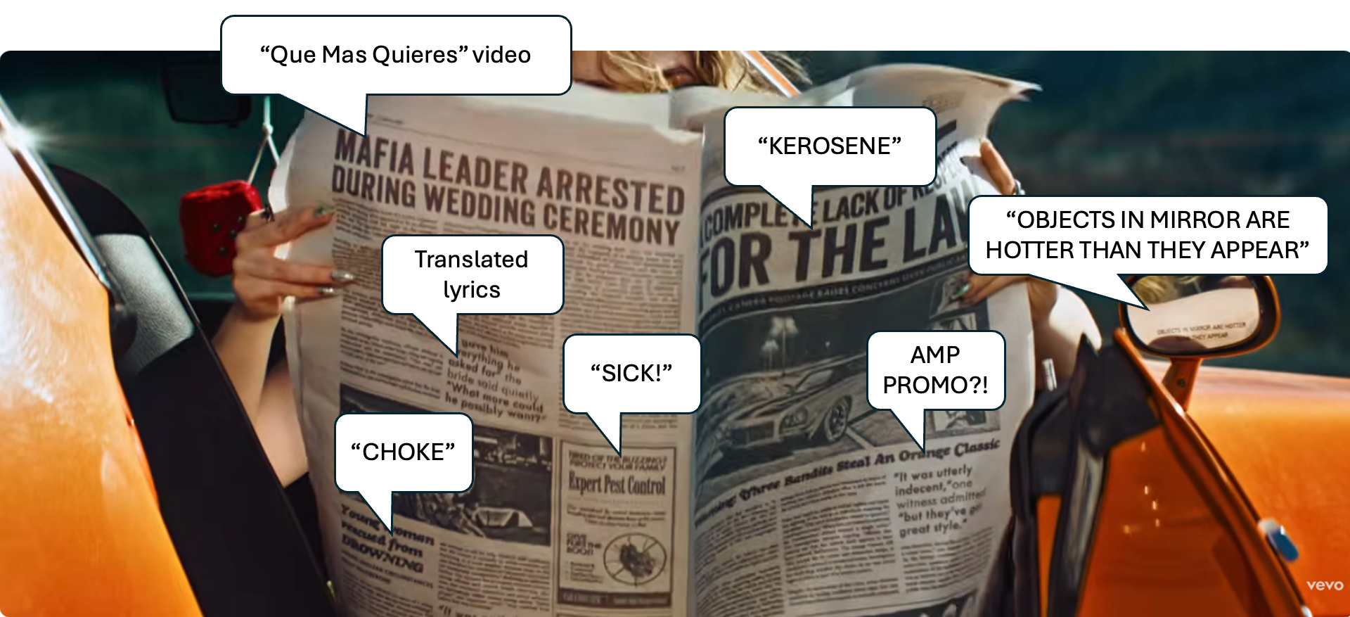 The video is full of fan service, with references to other videos, songs, band imagery, and even sponsorships tucked away here and there, along with some knowing jokes. One representative still is annotated below: