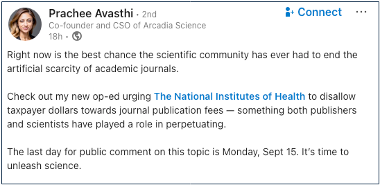 Yesterday, Prachee Avasthi of Arcadia Science — a fund founded with money from the sale of eDonkey2000 and some crypto schemes — published an attack on scientific publishers in the Wall Street Journal. It was timed to coincide with the last day to file responses to the NIH RFI on publication caps: