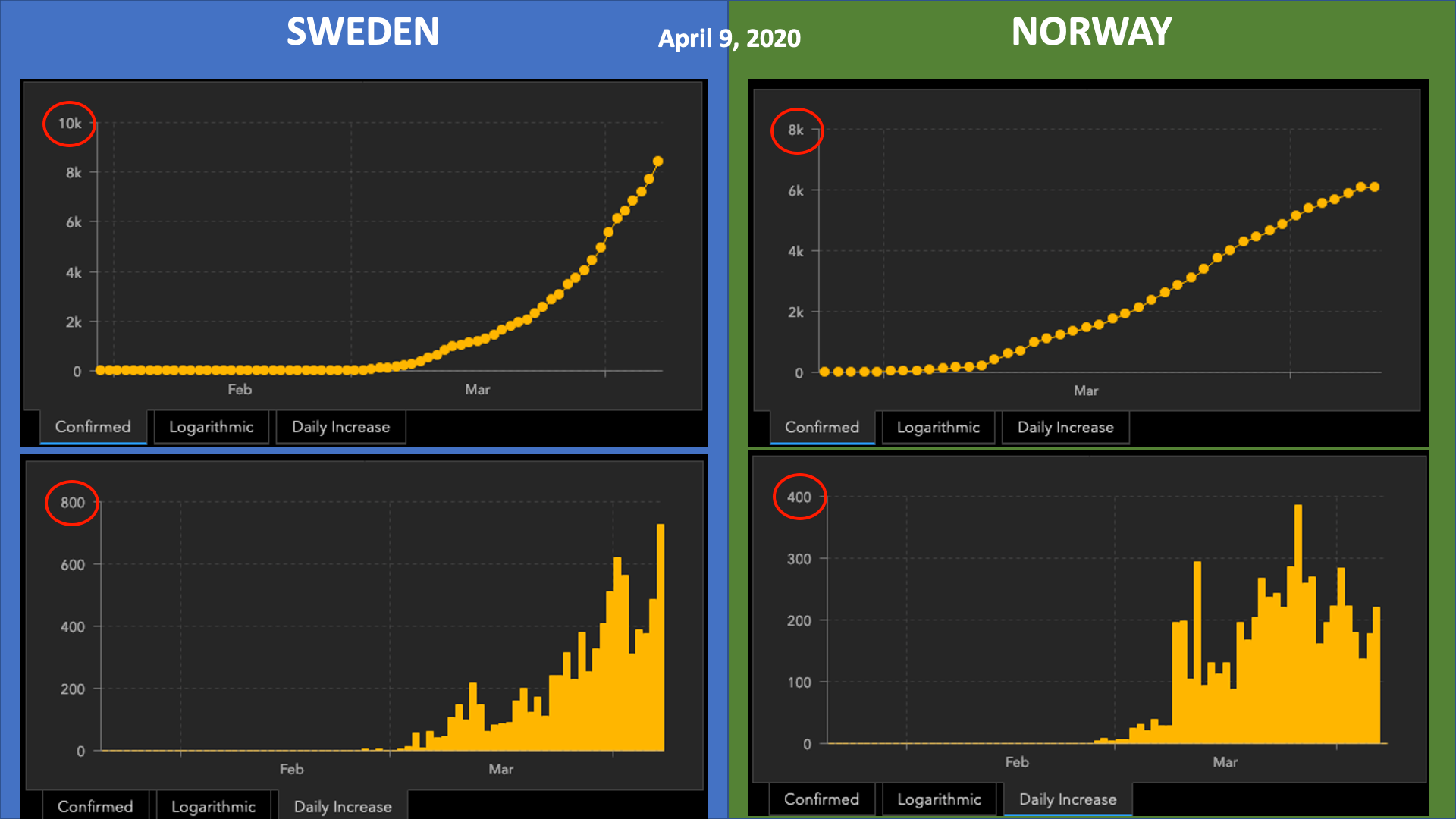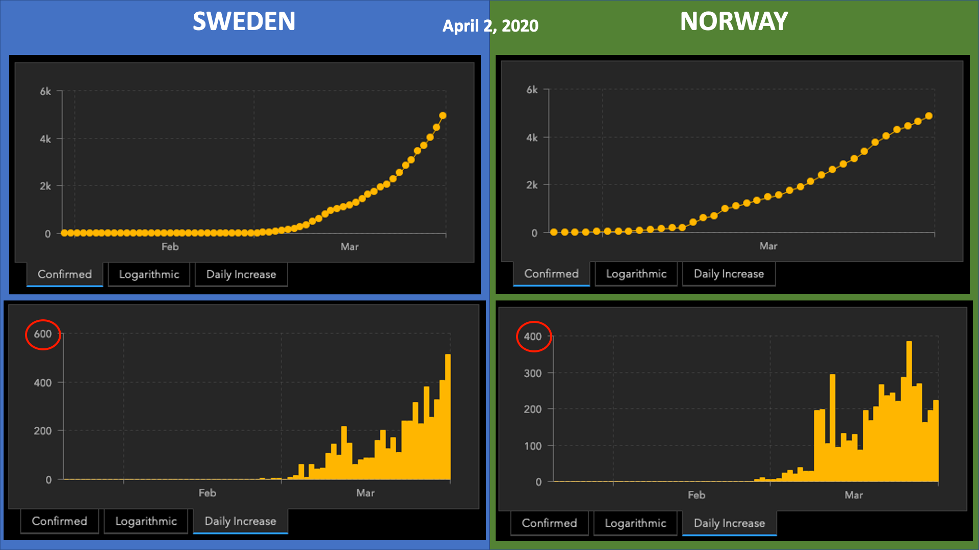 Both Swedish y-axes are higher than Norway’s. This time, capturing the “Daily Increase” for Sweden requires 2x the y-axis as Norway (their y-axis remained the same), while the “Confirmed Cases” y-axis for both increased — Norway, because they nosed over 6,000 cases as their curve appeared to flatten; Sweden, because they surged to over 8,000 cases.