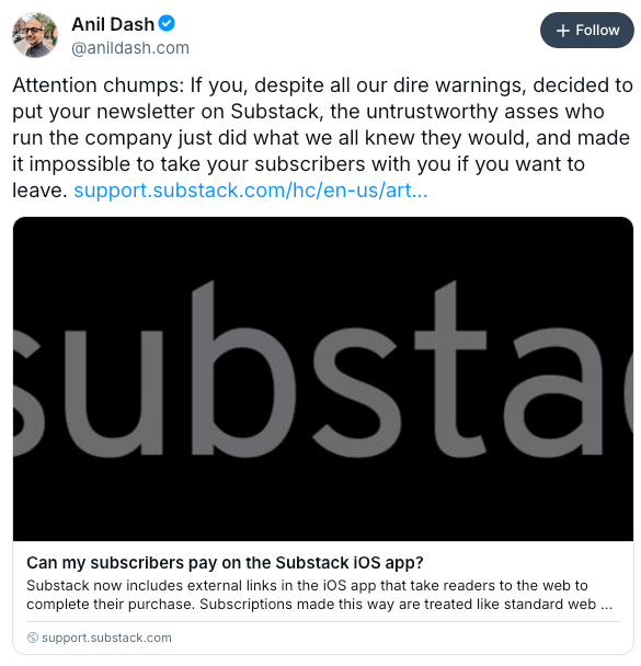 - This appears to be a way for Substack to start reducing the ability of its writers to move subscriber lists to other platforms . . .